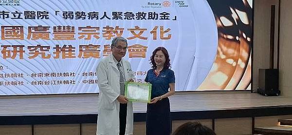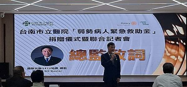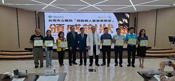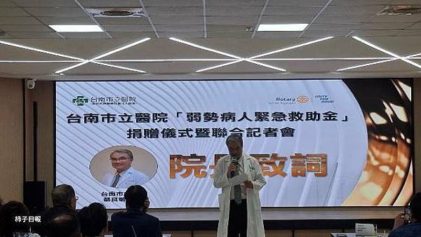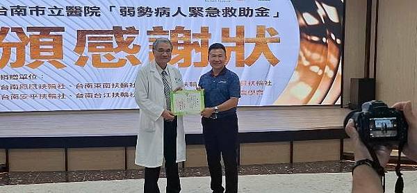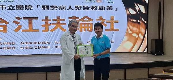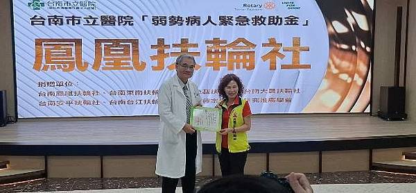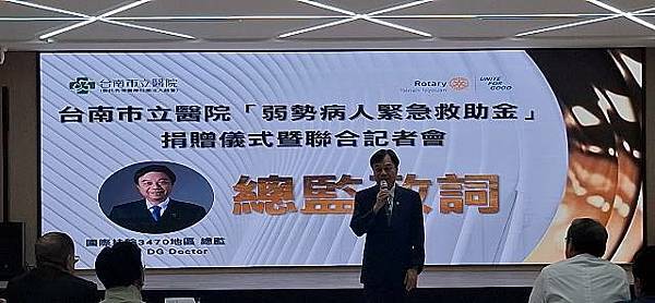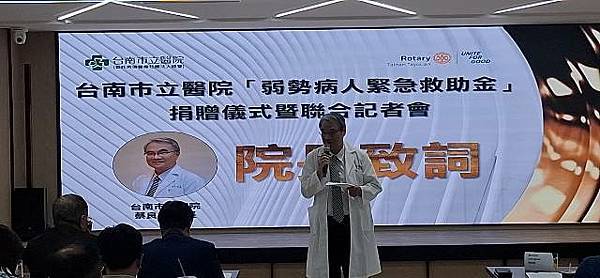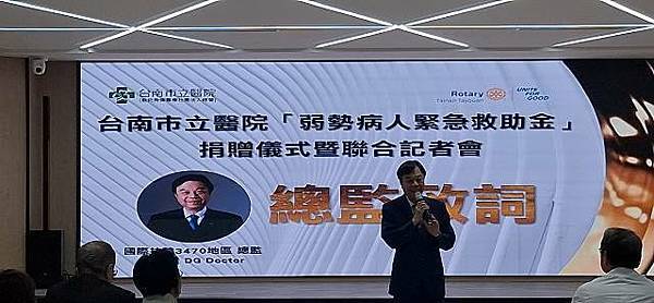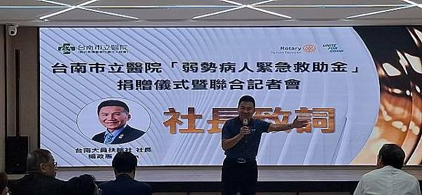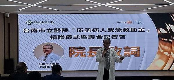 台南市立醫院院長蔡良敏感謝各扶輪社及學會的慷慨捐助,並承諾這筆款項將專款專用,作為弱勢病患的醫療補助。他指出,這筆基金的運作將如同生命線,讓醫療團隊能在最需要的時刻伸出援手。蔡院長也特別提到,台南大員扶輪社社長楊政憲的父親,正是他在大內地區巡迴醫療時照護的病人,如今楊社長與各社友的愛心捐款回饋社會,更讓他深感溫暖與欣慰。