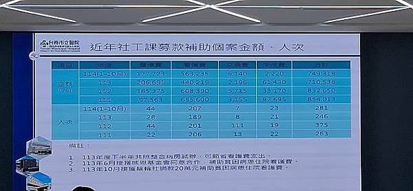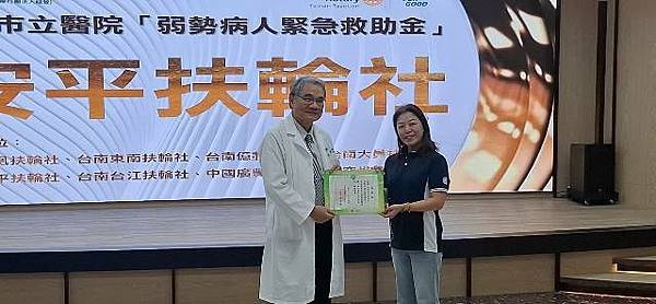 台南市立醫院社工課課長楊惠茹指出,今年(1~10月)的醫療扶助金總額約75萬元,其中約75%(約56萬元)用於支付看護費,另有25%(約18萬元)用於醫療費用,其餘則支援生活及交通開支。運用扶輪社專款共15案,其中一名80歲的阿義,獨居多年、無親人依靠,因大腸癌需住院治療,儘管有低收入戶補助,但龐大的看護費用讓他壓力沉重,在社工協助下以扶輪社專款及其他慈善會支持,得以安心治療。另一名77歲的阿忠是獨居的個案,因腎盂惡性腫瘤需依賴導尿管,近來因泌尿道感染反覆入院,亦由扶輪社專款支援,讓他安心住院治療並順利銜接長照資源返家。