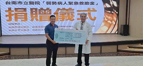 蔡院長表示,醫院將以公開透明的方式運用這筆善款,確保每一分捐款都能用在最需要的地方。他強調,這筆基金不僅是一筆錢,更是社會對弱勢族群的守護與承諾,讓病人能安心接受醫療照護。此次捐贈儀式由國際扶輪3470地區總監莊和達、台南二分區助理總監林方山、台南大員扶輪社、台南鳳凰扶輪社、台南東南扶輪社、台南億載扶輪社、台南安平扶輪社、台南台江扶輪社,以及中國廣豐宗教文化研究推廣學會共同出席,見證這場愛心傳遞的溫馨時刻。捐贈儀式期間台南二分區助理總監林方山響應善舉,代表台南東區扶輪社加捐款項1萬元,亦有社友持續追加善款共襄盛舉,為弱勢民眾盡一份心力。