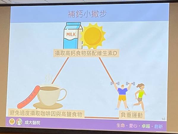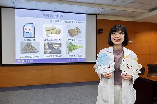 成大醫院營養部黃薇營養師說明,鈣是人體內含量最多的巨量礦物質營養素,99%存在骨骼及牙齒中,幫助維持骨骼強健;剩餘1%分布於軟體組織與體液中,控制肌肉收縮、神經訊息傳導、細胞內訊息傳遞與荷爾蒙分泌等重要功能。