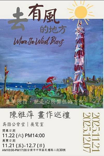【柿子日報記者李玲/台南報導】「去有風的地方~陳雅萍畫作巡禮」即日起至12月7日在吳園藝文中心公會堂展出,誠摯邀請喜愛藝術與生活美學的民眾蒞臨欣賞。