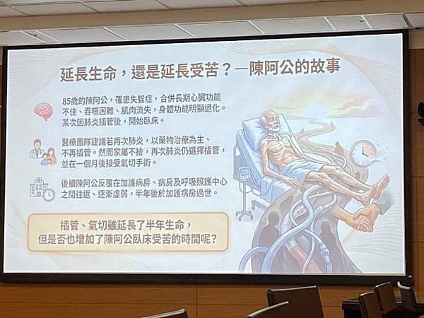 【柿子日報記者李玲/台南報導】85歲的陳阿公卻沒有這麼順利。陳阿公罹患失智症,合併長期心臟功能不佳、吞嚥困難、肌肉流失,身體功能明顯退化。阿公因肺炎引發呼吸衰竭而插管,雖然成功拔管,但從此開始臥床。醫療團隊建議,若後續感染,可考慮藥物治療為主、不再插管。然而家屬不捨,再次肺炎時仍替阿公選擇插管、並在一個月後接受了氣切手術。之後陳阿公反覆在加護病房、病房及呼吸照護中心之間往返、逐漸虛弱,半年後於加護病房過世。插管、氣切雖延長了半年生命,但是否也增加了陳阿公臥床受苦的時間呢?