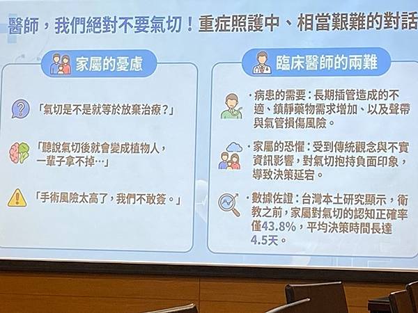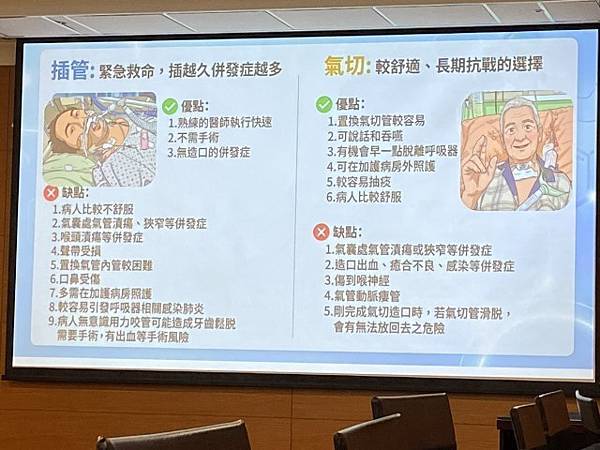 王聖媛醫師提醒,插管與氣切都不是例行治療,也不能以「救」或「不救」來簡化。每位病人的整體病情、可逆性、生命哲學和期待都不同,最重要的是:這個決定是不是能讓病人活得更有品質、符合自身期待與舒適需求。重症醫療團隊會透過完整評估、專業判斷和充分溝通,陪伴每個家庭做出最適合的決策。
