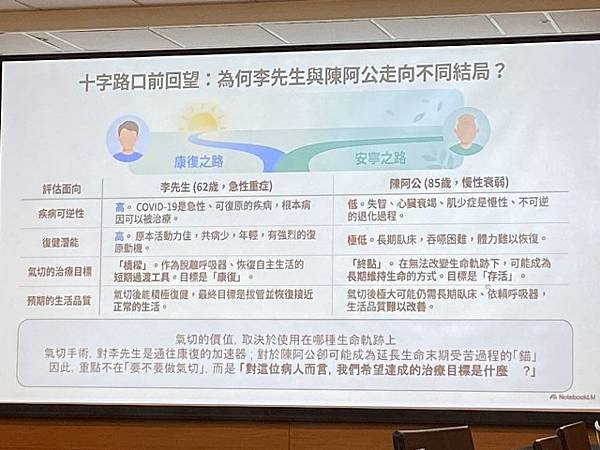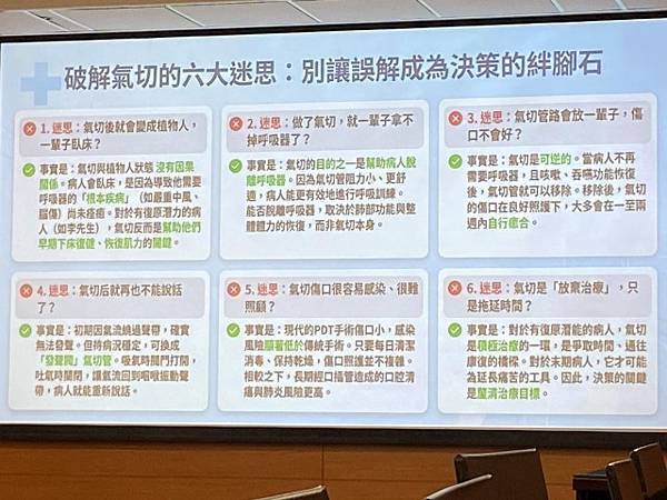 末期病程與多重共病者的難題,插管或氣切都可能只是延長受苦核心精神:以病人的意願與生活品質為中心,共同決定對於臥床、多重共病、衰弱老者或病程已進入末期的患者,即使進行插管或氣切,也無法改變生命將走到尾聲的現實。由於體力難以恢復、疾病不可逆,氣切後仍高機率需長期依賴呼吸器,甚至進入「侵入性治療—感染—住院—再感染」的循環。