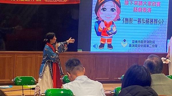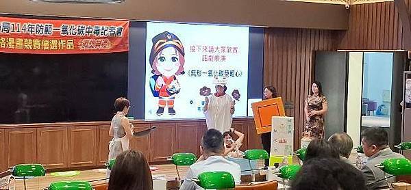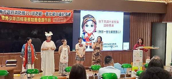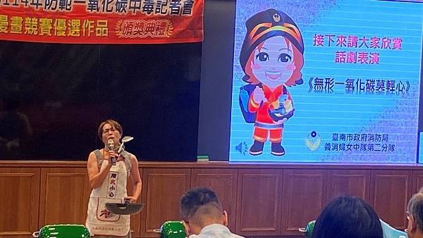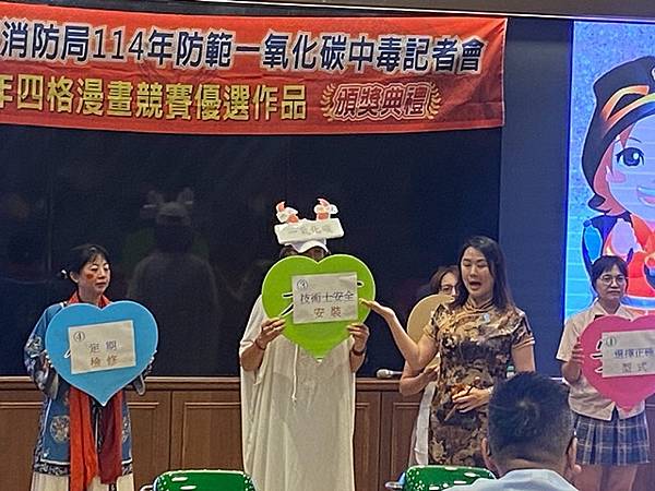 消防局於每年12月到隔年2月一氧化碳預防季辦理一系列宣導,並特於114年12月3日在中信金融管理學院哈利波特講堂舉辦「防範一氧化碳中毒宣導記者會」,記者會重頭戲由義消婦女中隊第二分隊帶來原創古裝話劇——《無形鬼氣莫輕心》,以詼諧生動的方式演繹村民冬日取暖不慎引發中毒的情境,呼籲「勿關窗取暖」「保持通風、使用合格熱水器」收尾,讓民眾在看劇時學會防範一氧化碳的關鍵要點,達到寓教於樂的目的。