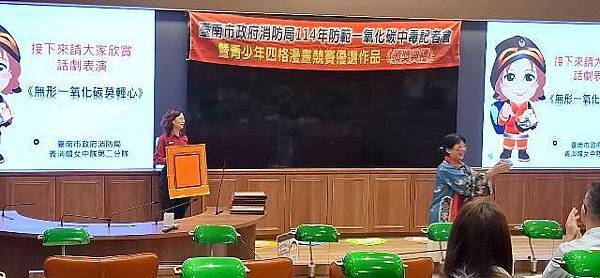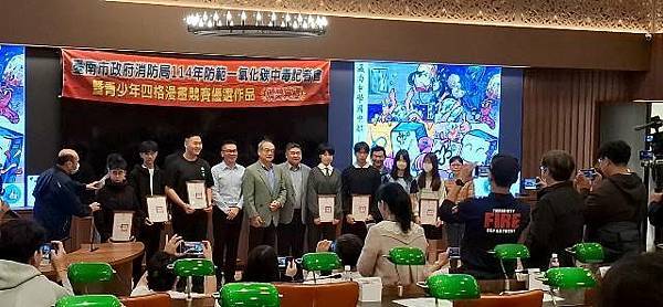 活動同場舉辦臺南市政府「114年宣導防範居家一氧化碳中毒青少年四格漫畫競賽」優選頒獎典禮,這12件優秀作品不僅畫風活潑生動,其作品名稱和說明更是精準地捕捉了防範一氧化碳(CO)中毒的三大核心警訊,成為消防宣導的最佳教材,這些作品也代表臺南市參加全國比賽榮獲2優等、4佳作及1名網路人氣獎之佳績。